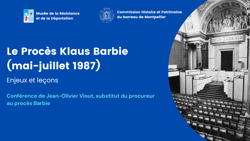 Le Musée de la Résistance et de la Déportation et la Commission Histoire et Patrimoine du Barreau de Montpellier, avec la participation de la ville de Castelnau-le-Lez, proposent une conférence exceptionnelle de Jean-Olivier Viout, substitut du procureur au procès de Klaus Barbie,